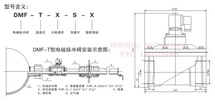 DMF-T型電磁脈沖閥為直通閥,其進氣口之間夾角為180°,(進出口中心線為同一直線),其進口與儲氣筒連接,出口與噴吹管連接。氣流暢通,能提供符合要求的清灰氣脈沖。