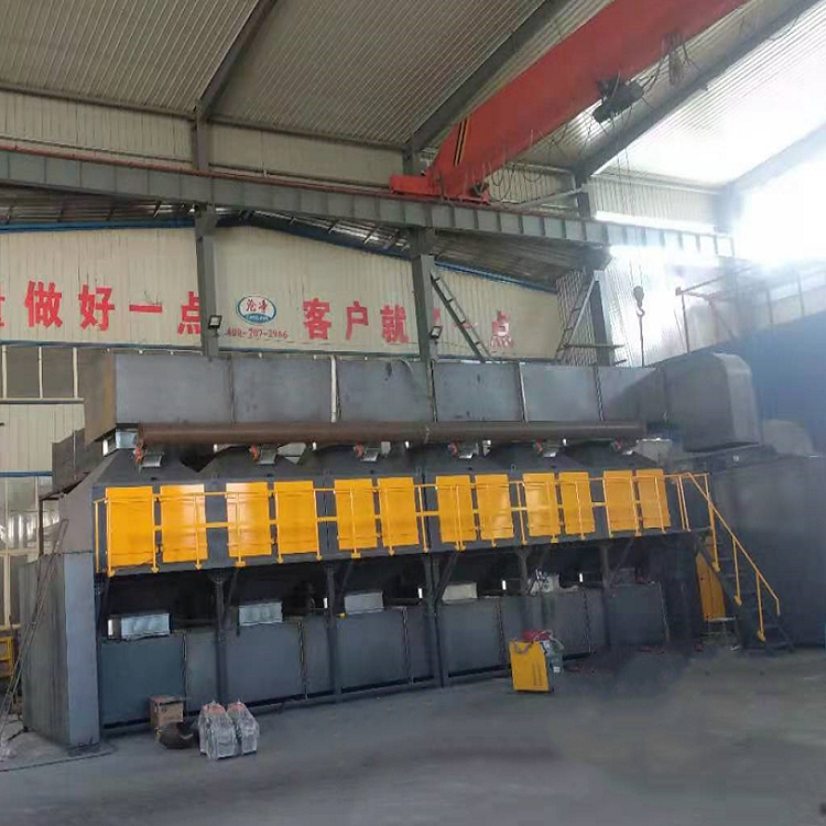 通過前面的預處理后,廢氣通入后端的活性炭吸附/脫附塔進行吸附處理,通過活性炭微孔的有機氣體吸附在活性炭表面,去除廢氣中的有機物,抵達凈化氣體的作用。 催化燃燒裝置活性炭進行脫附時,打開防爆閥同時啟動脫附風機對催化劑進行15分鐘的吹掃,然后防爆閥和脫附風機關閉,3組加熱管開始分階段加熱,間隔2分鐘開啟一組,當催化燃燒裝置溫度加熱到200攝氏度時,脫附風機打開,將熱空氣向吸附箱吹送,熱空氣輸送到混流箱,進行空氣中和,但熱空氣在混流箱內溫度達到特定溫度時,空氣通過下端的輸送管輸送到活性炭的吸附室內,對活性炭進行脫附,活性炭室內溫度慢慢升高,活性炭內有機廢氣分解出來,通過上面的管道回到催化裝置內。與催化劑反應生成CO2和H2O,同時產生大量的熱量。這時候加熱管會根據室內溫度自動調節關閉一組或幾組加熱管,節約能源,催化劑表面都有陶瓷蓄熱體,能有效的鎖住熱量,降低能耗。
